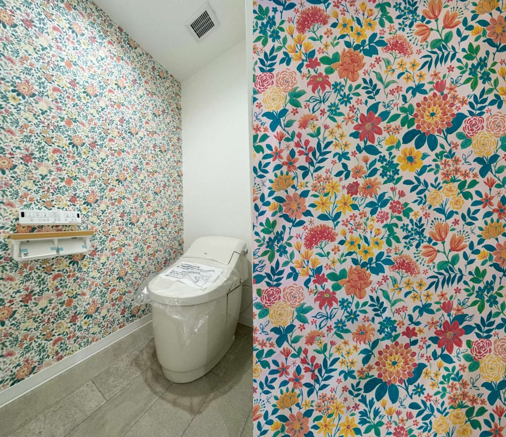 側面だけ花柄壁紙クロスを採用し、トイレ引き戸を開けた瞬間にお花畑が広がります。