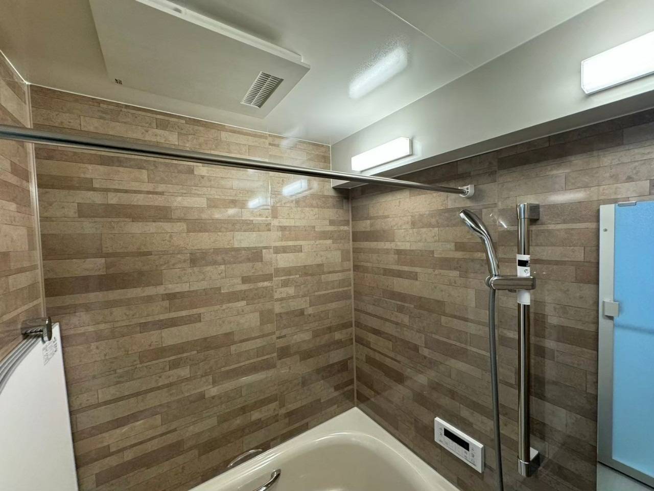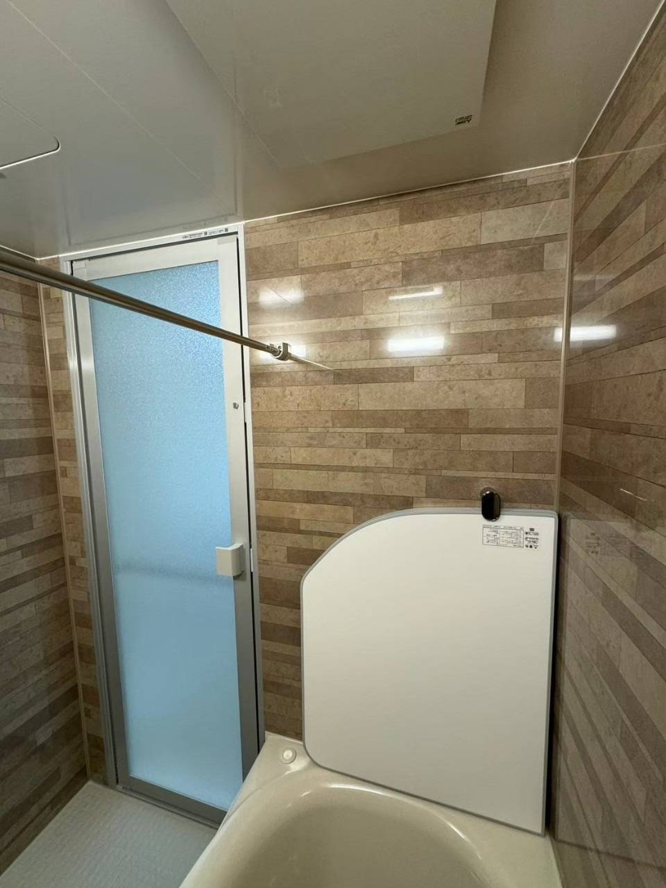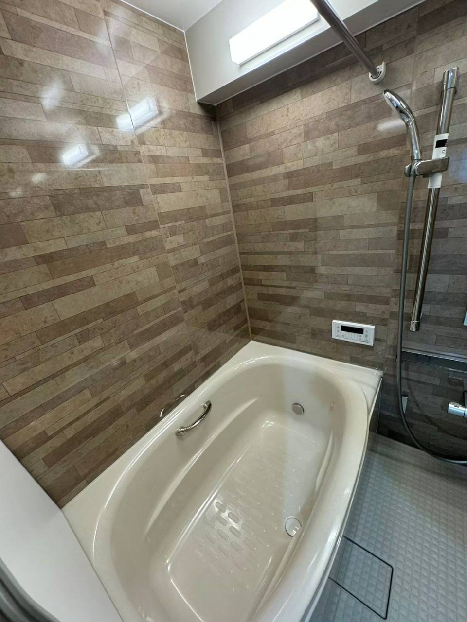 LIXILのシステムバス、「リノビオV」を施工。 天然石をイメージしたセブストーン柄の壁面パネルがとても素敵です。