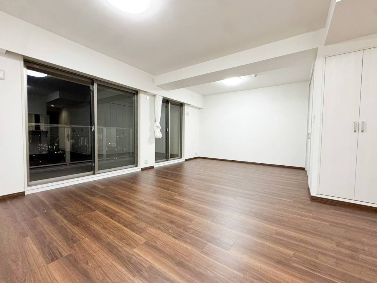 真っ白な壁と天井、収納ドアにウォールナットのフローリングが高級感のあるリビングを演出してくれています。