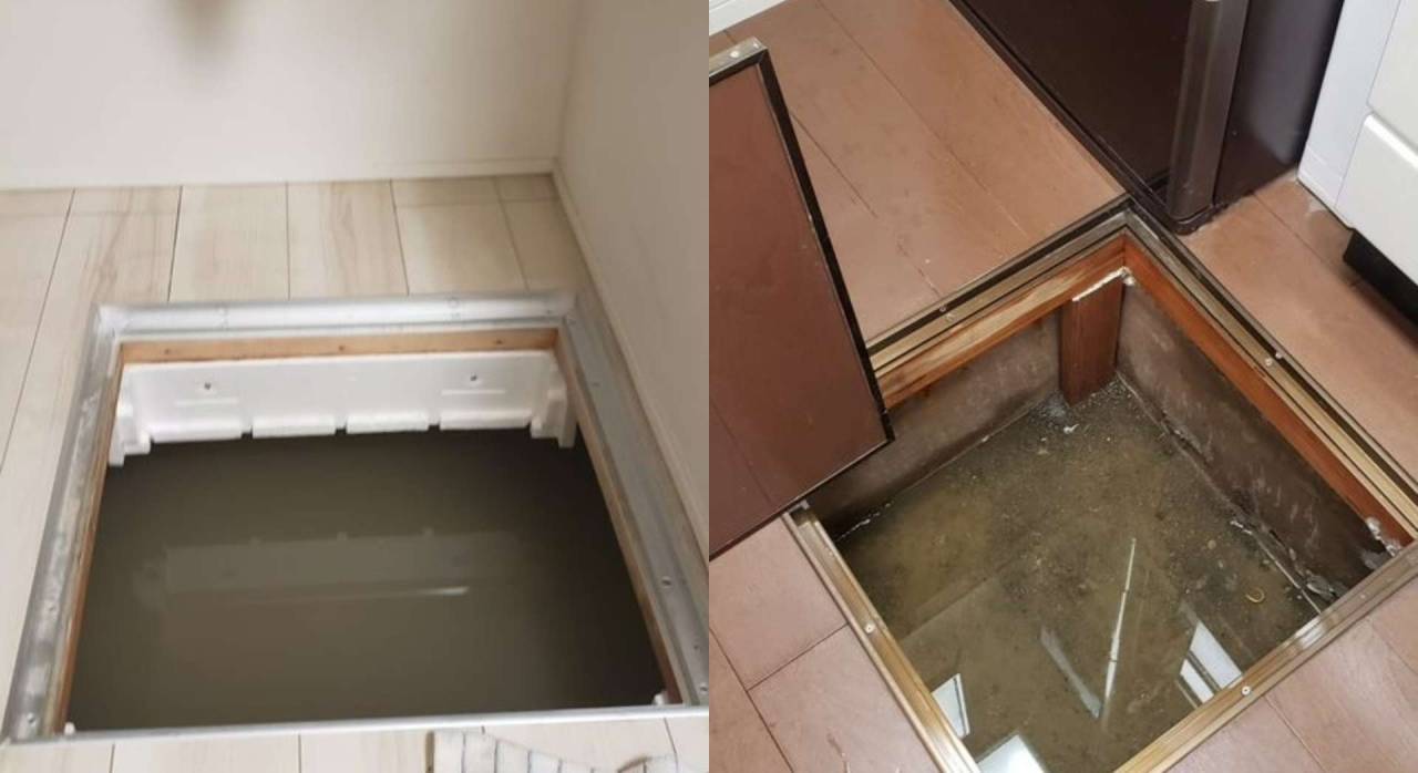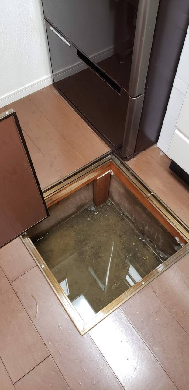 台風後 — フローリングを開けたら「床下に雨水がたっぷり」