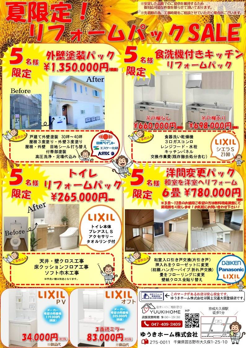 今年の夏は、ゆうきホーム史上最大級の「リフォームSALE」を実施中です! なんと、国の補助金制度が使える特別パックを多数ご用意しました。