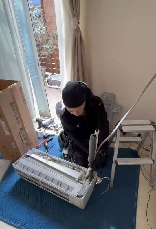 全身を横にし、わずかな隙間で6mの冷媒配管を正確に通す姿。 プロ中のプロにしかできない技術です。