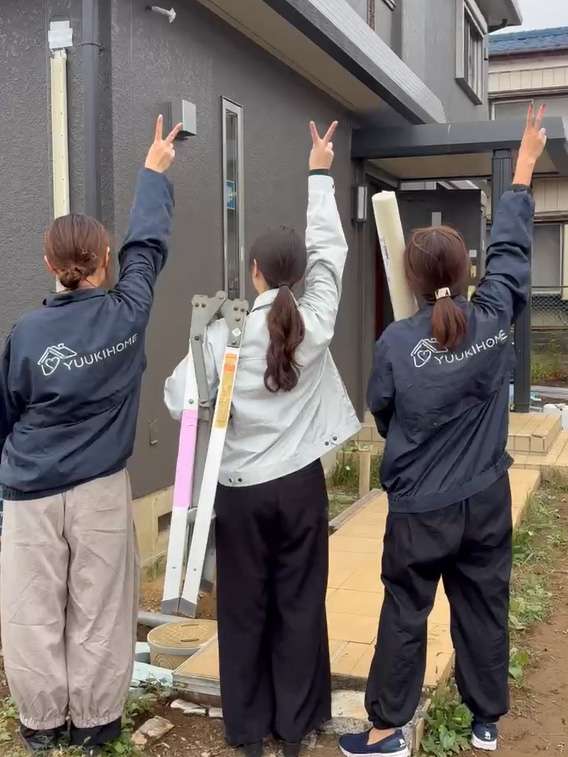 こちらの写真に写っているのは、ゆうきホーム株式会社の 女性スタッフです! ゆうきホーム株式会社には女性の事務スタッフはもちろん、女性の現場作業員・女性職人 も在籍しております。