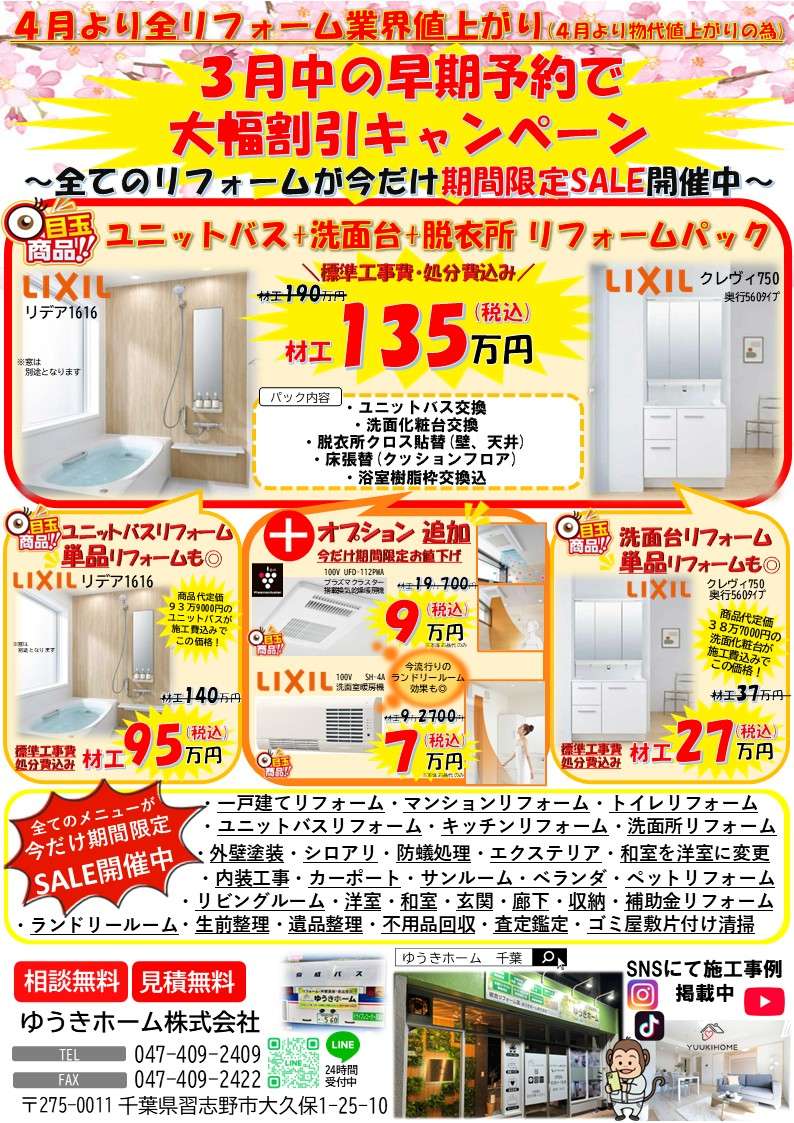 3月まで早期予約!4月から全リフォーム会社値上がり 習志野市 船橋市 八千代市