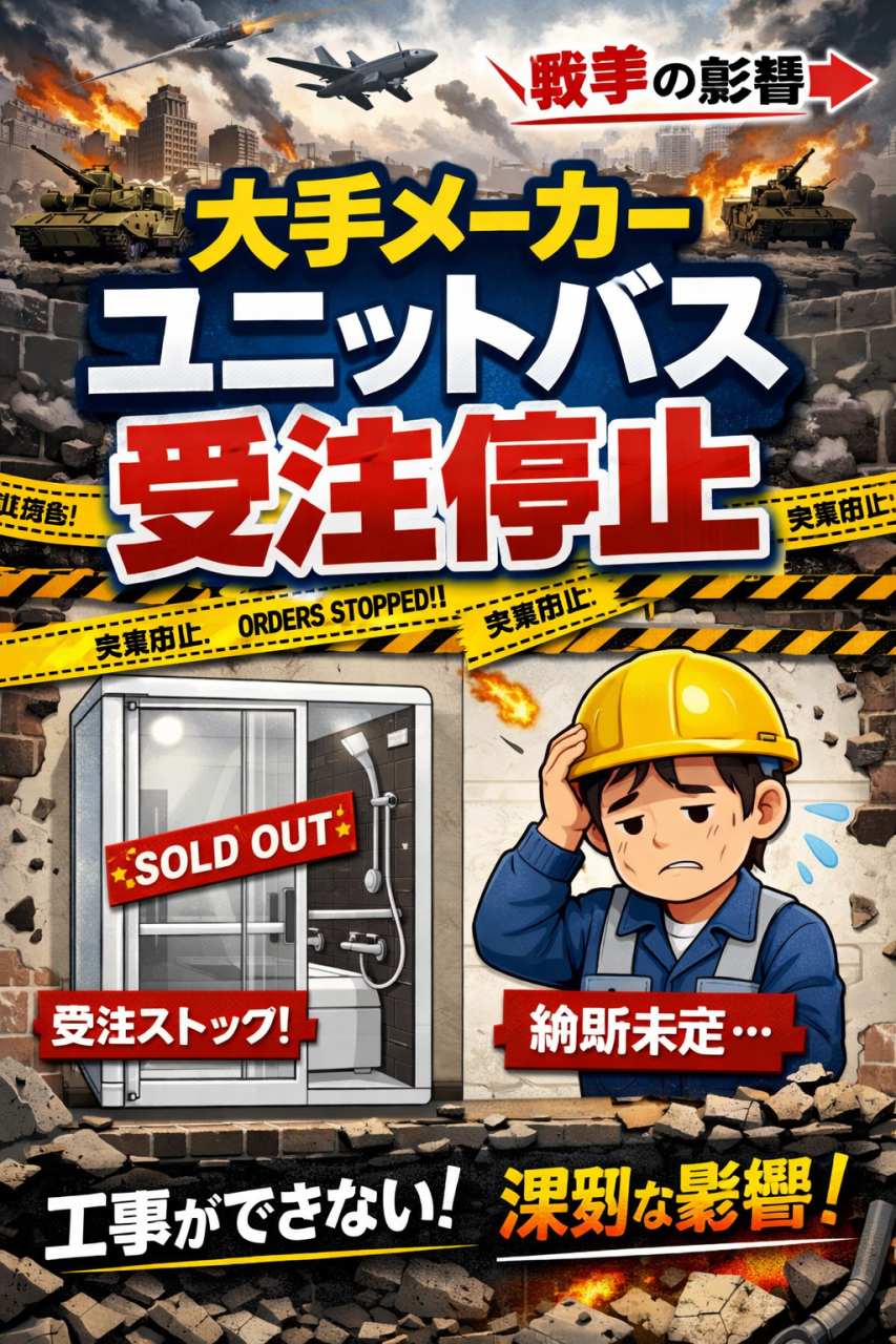すでにご存知の方もいらっしゃるかもしれませんが、現在、大手住設メーカー各社において、ユニットバス(システムバス)の「受注停止」や「納期未定」という異例の事態が続いています。