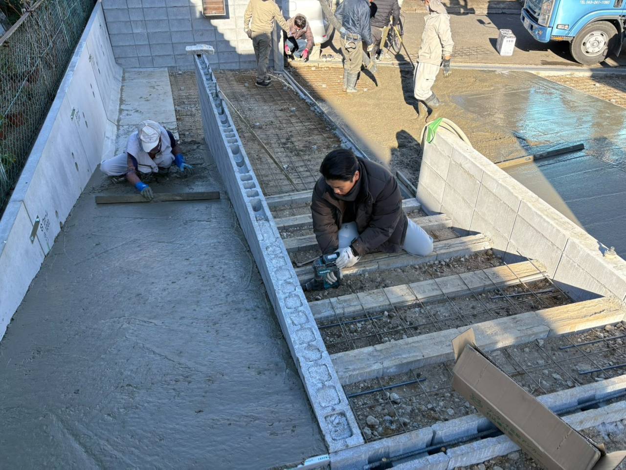 写真をご覧いただくとわかる通り、コンクリートを流し込む前には、地面をしっかりと固め、**ワイヤーメッシュ(鉄筋)**を張り巡らせています。これにより、重い車が乗ったり長年使用したりしても「ひび割れ」や「沈み」が起きにくい、強固な土間が完成します。