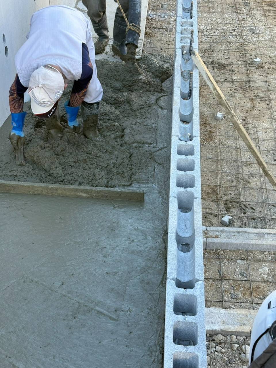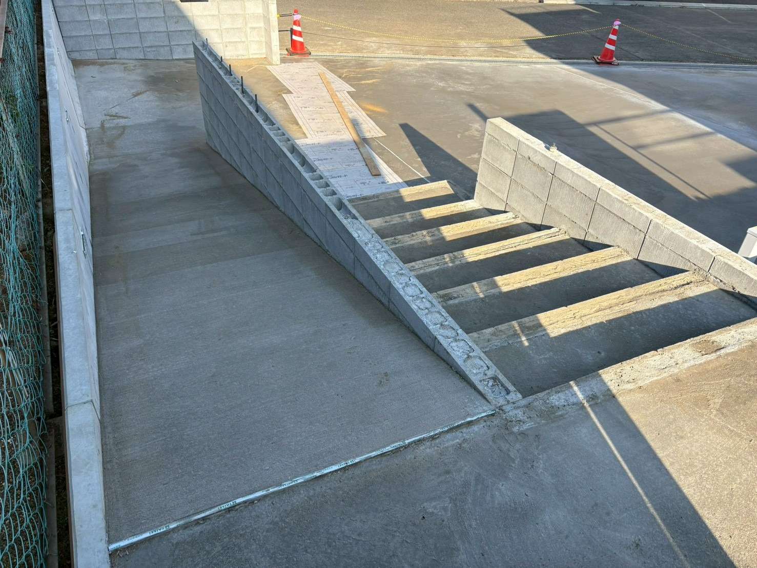 現場には大型の生コン車を配備。新鮮で高品質なコンクリートを適切なスピードで流し込みます。スロープ部分は勾配(角度)が重要なため、熟練の職人がミリ単位で調整を行いながら作業を進めます。