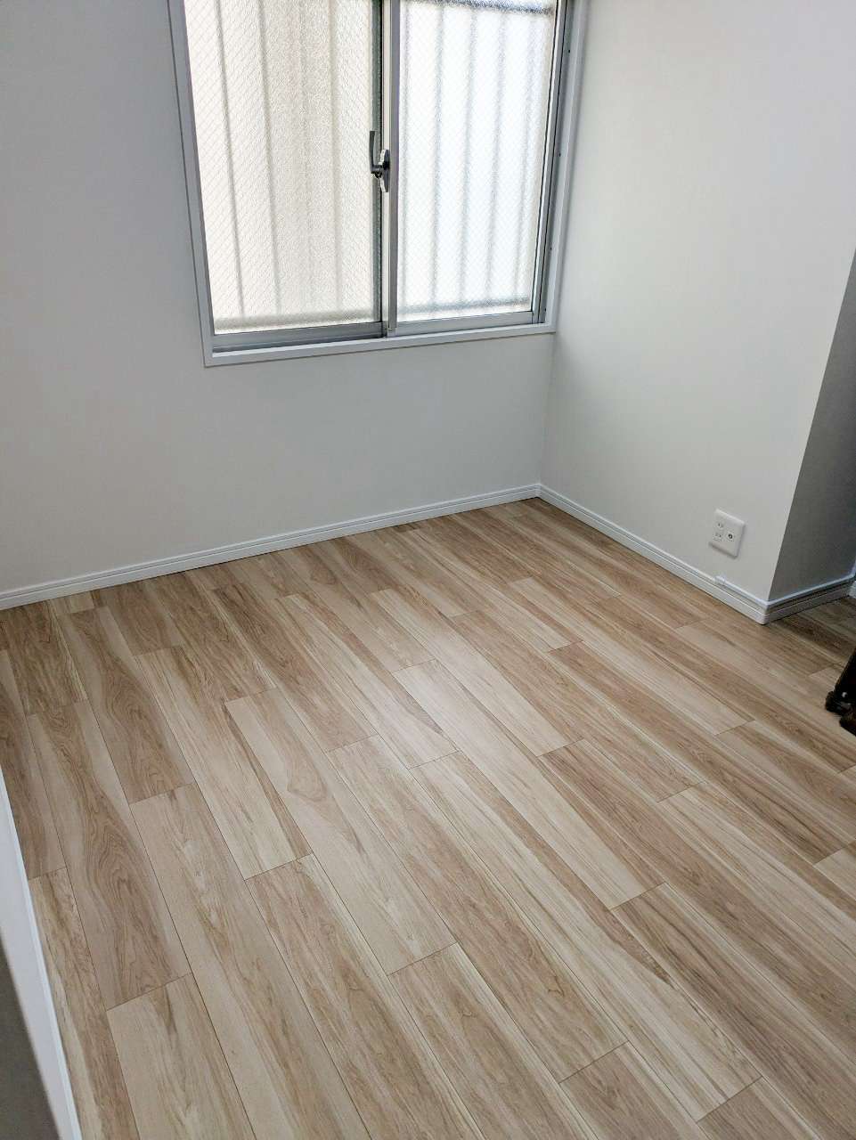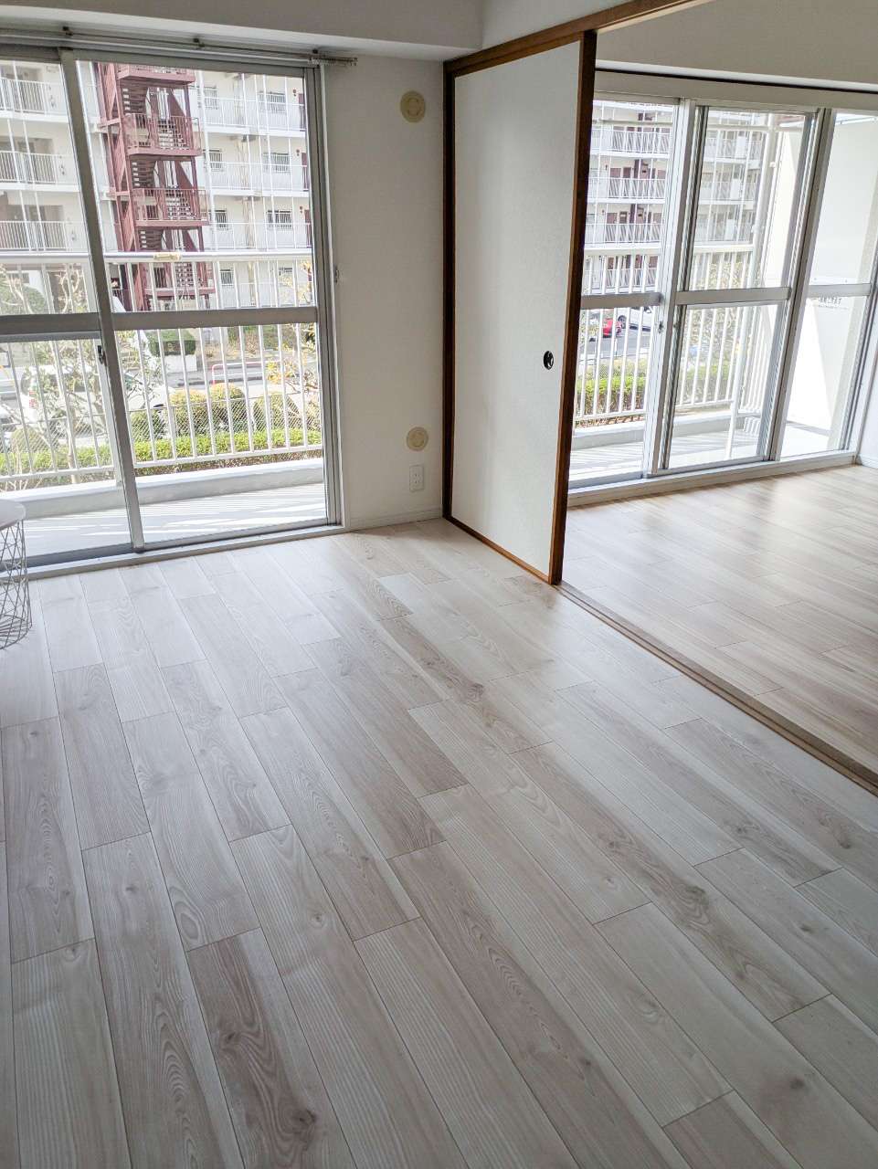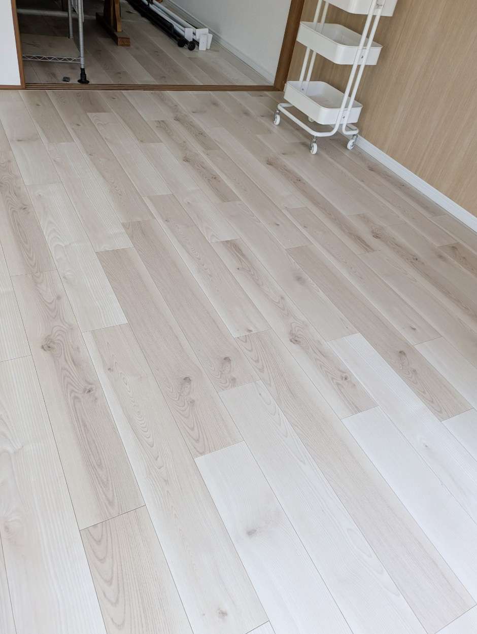 お部屋が広く見えるのはフローリングの色選びにポイントがあります。フローリングの色は明るいものから暗いものまで種類が豊富で、色の濃さも淡いものから濃いものまで多数あります。今回はお客様の好みやほかのお部屋と統一感を持たせるために、白系の淡いメープルカラーを選んだことで、お部屋が広く感じられる空間となったのです。