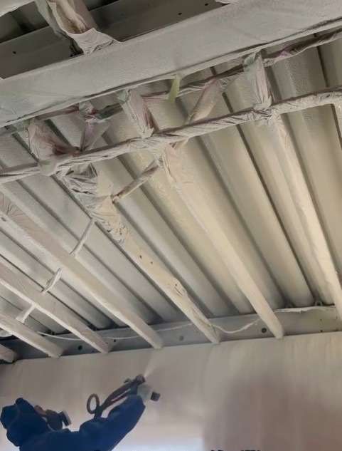そこでご提案したのが、天井裏全体への硬質発泡ウレタン吹付施工です。施工は2階の天井裏全面と、ベランダ下の天井部分を中心に行いました。硬質発泡ウレタンは発泡することで隙間なく密着し、鉄骨の複雑な構造にも対応できるため、従来の断熱材では難しい部分もしっかりカバーすることが可能です。