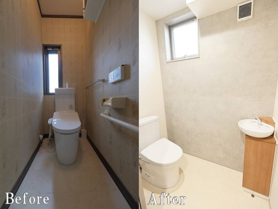 Beforeのダークトーンの巾木や古い床から一転、Afterでは床を明るい膨張色に、壁をシックな引き締め色に設定。 この視覚的なバランス調整により、リフォーム前よりもトイレ空間が広く、開放的に感じられるよう工夫しました。