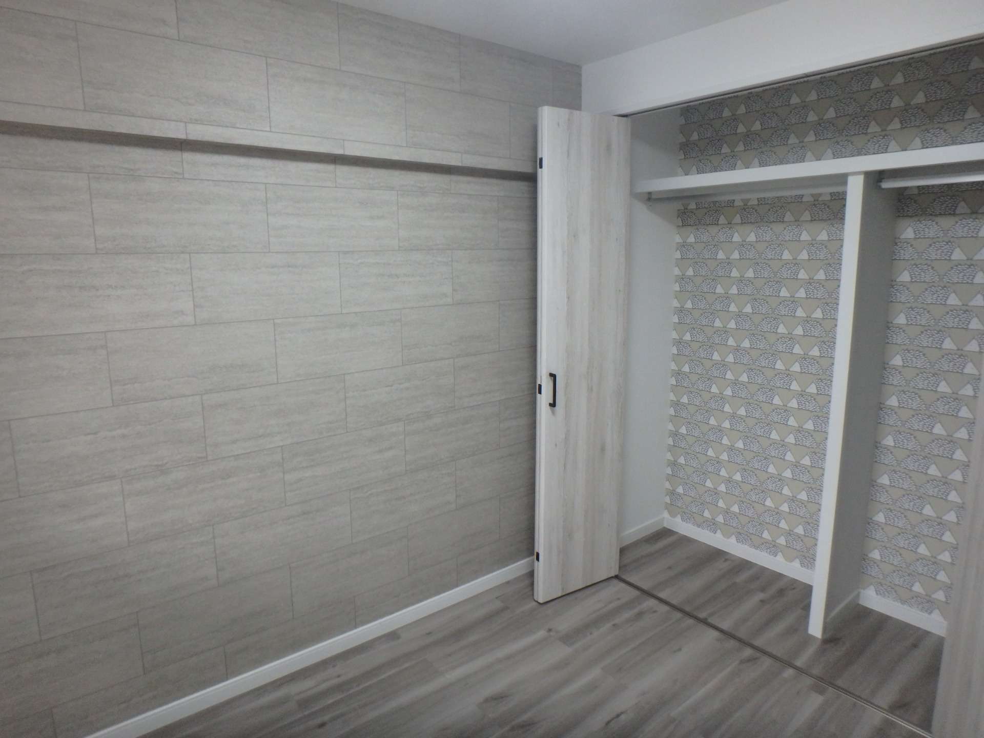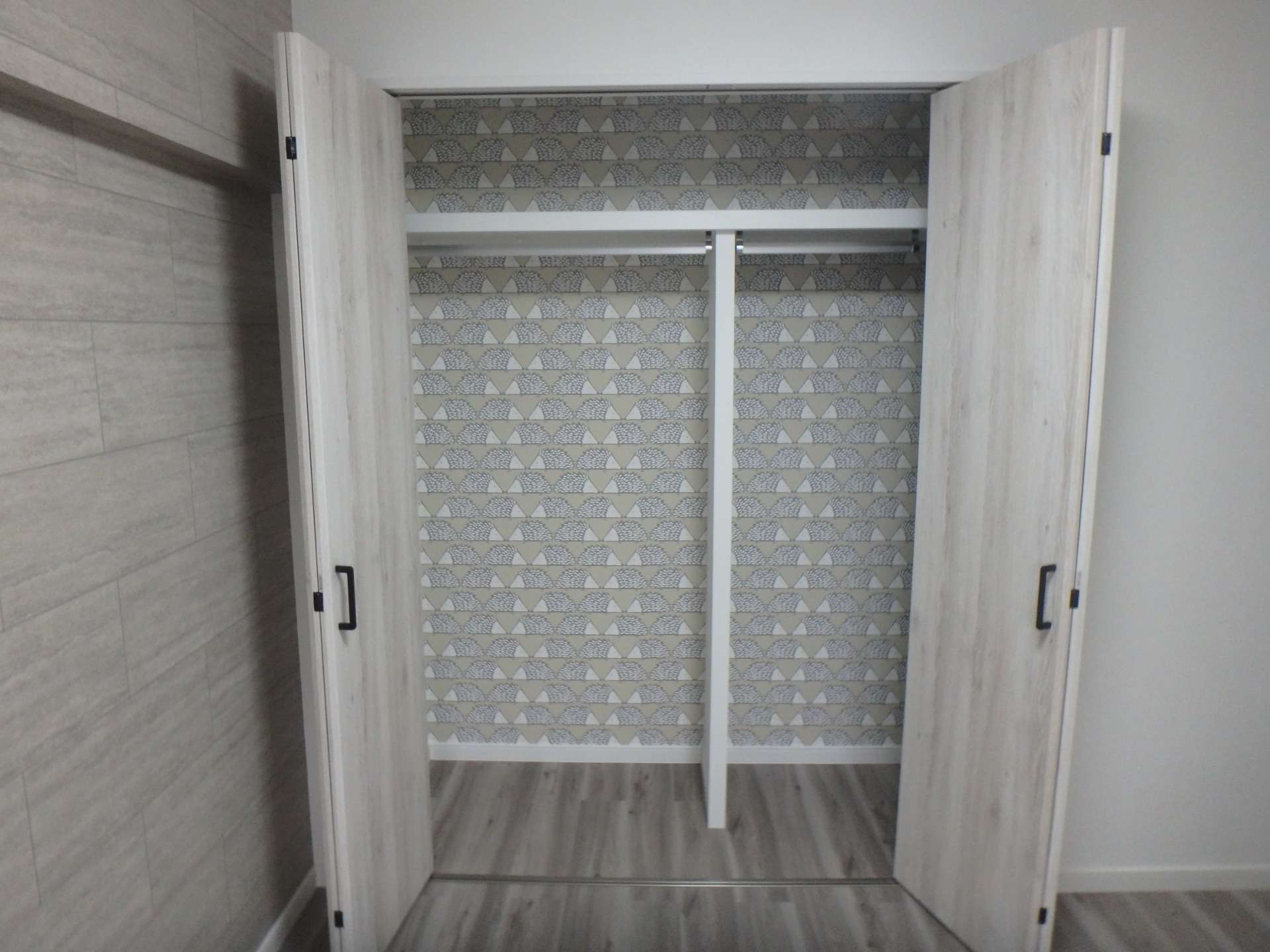 よく見てみてください。クローゼットの扉を開けると、そこには可愛らしい**「ハリネズミ柄」**のアクセントクロスが広がっています。 グレージュの落ち着いたトーンの中に、クスッと笑みがこぼれるような遊び心。毎朝の着替えや片付けの時間が、少しだけ特別なものに変わります。
